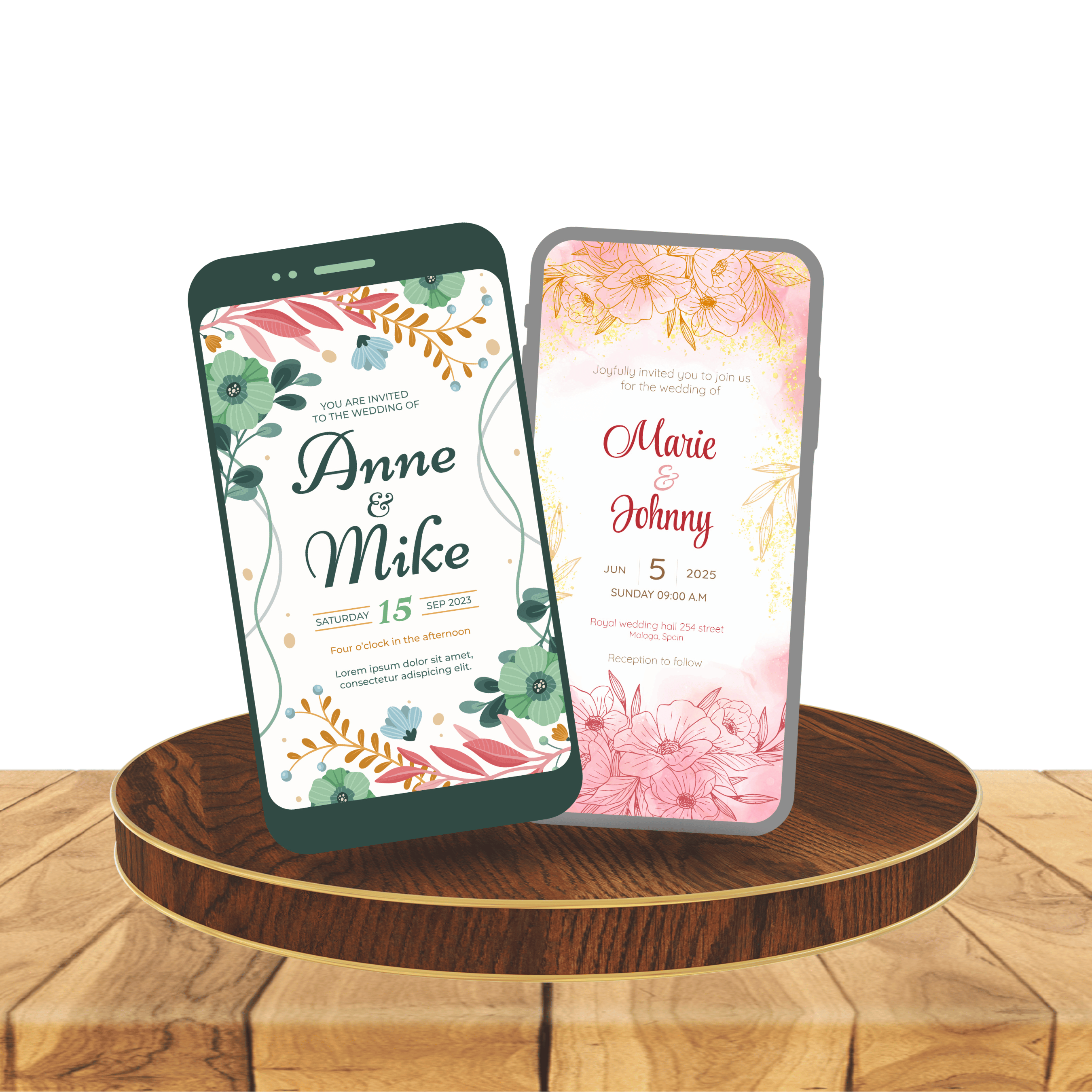 Diseño de invitaciones digitales personalizadas para bodas o cumpleaños, con un estilo único y elegante, listas para ser compartidas fácilmente por redes sociales o Whatsapp.